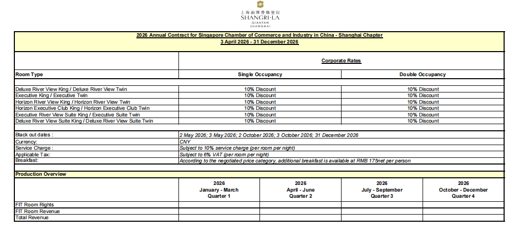 All SingCham members can enjoy 10% discount for room rates at SHANGRI-LA Qiantan Shanghai.